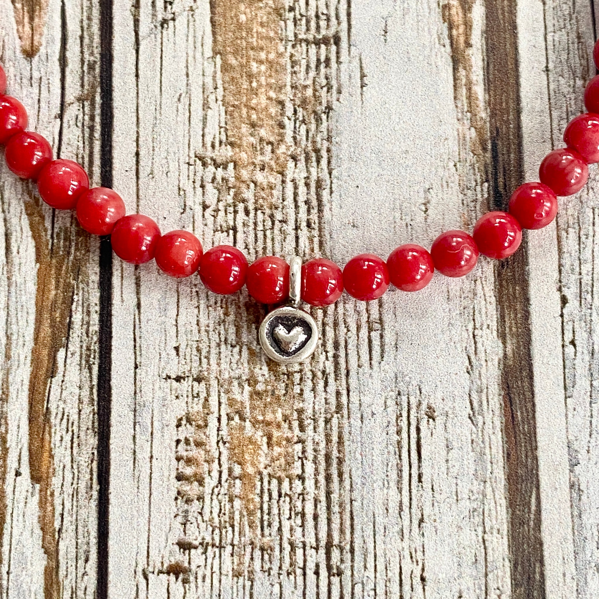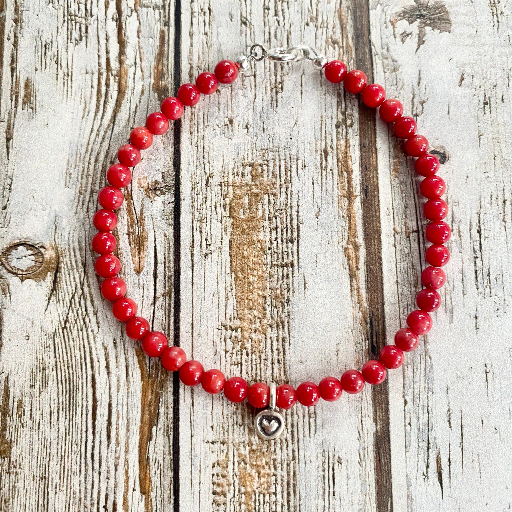 4mm red coral beads and a silver heart charm with a silver bolt clasp. Finished at 7.5cm