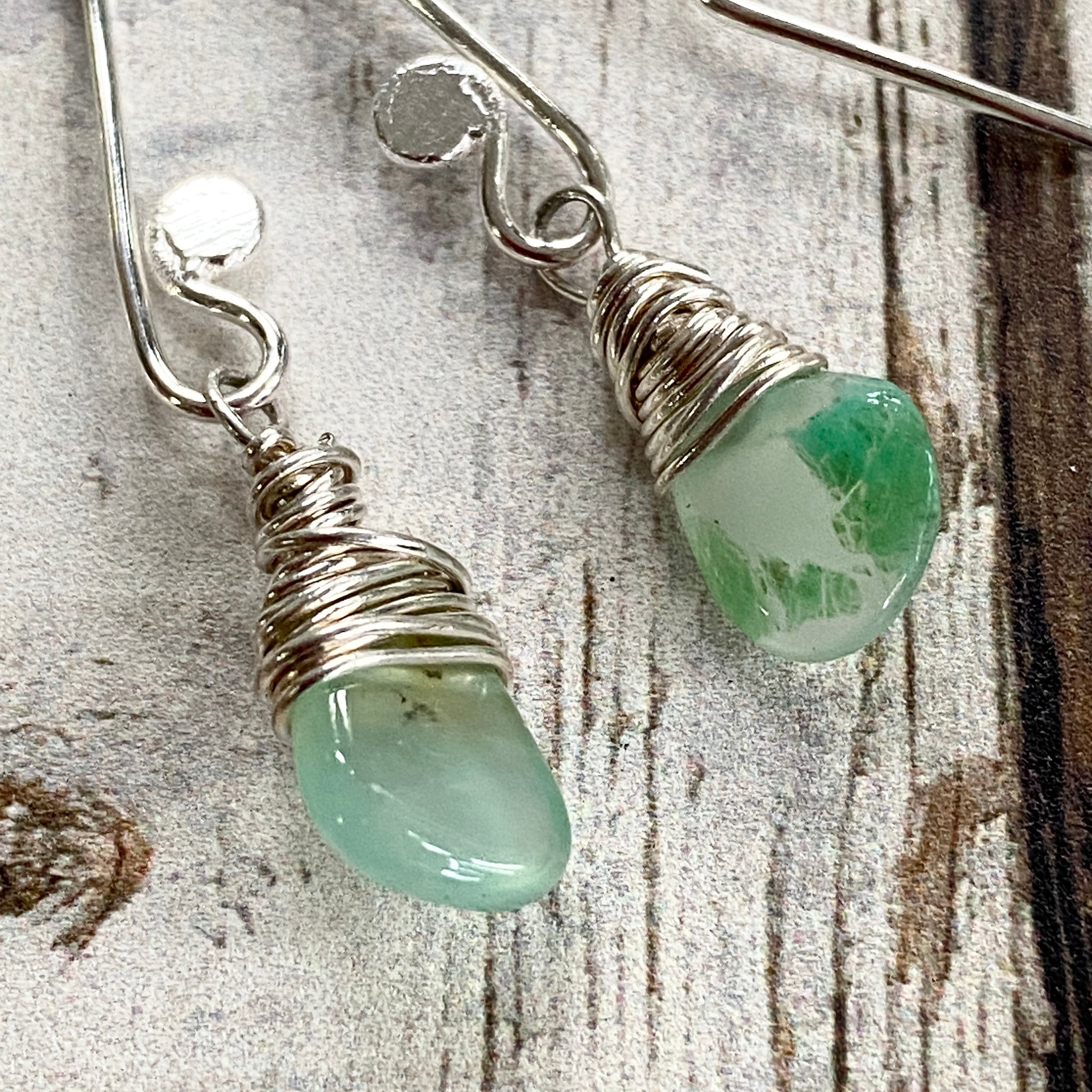 These polished slices of Australian chrysoprase have been wrapped in fine silver wire and hangs on sterling silver French ear wires.
