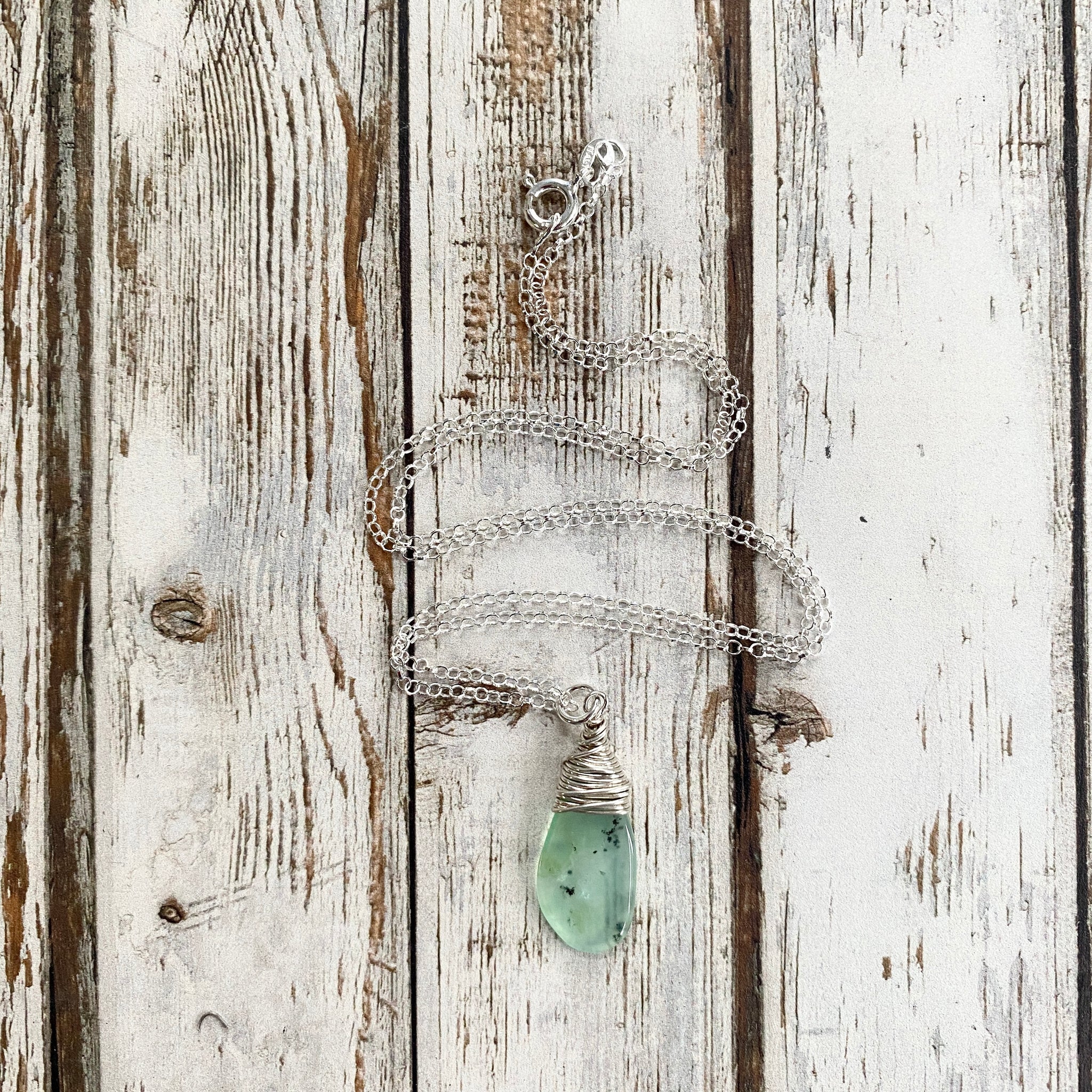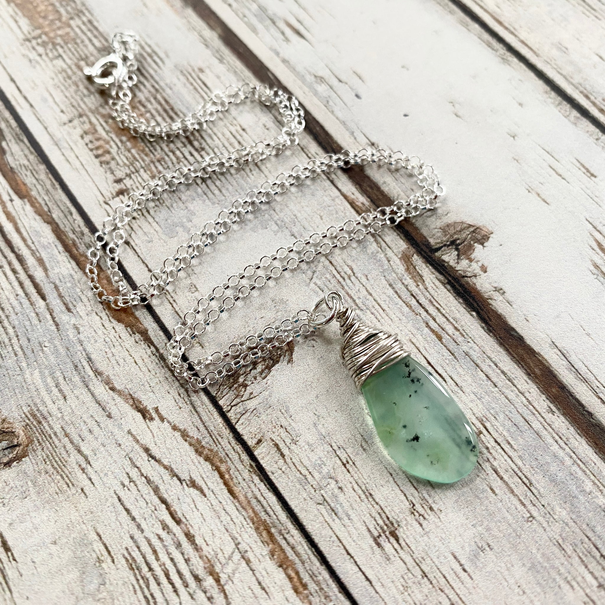 This polished slice of Australian chrysoprase has been wrapped in fine silver wire and hangs on an 18 inch sterling silver belcher chain.