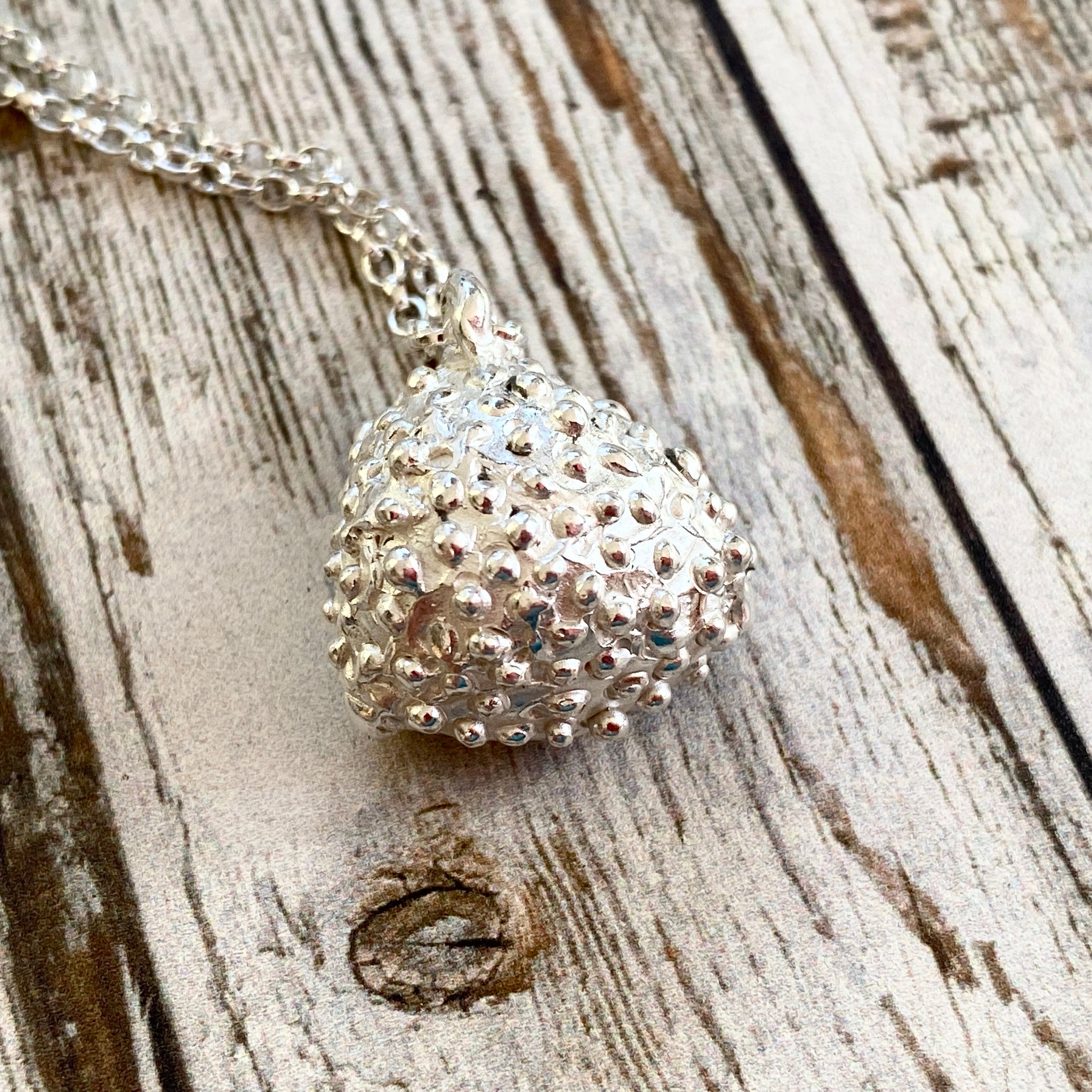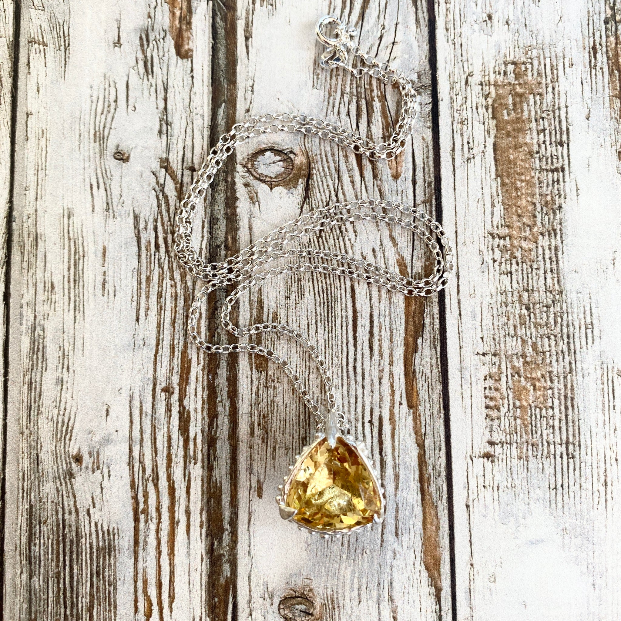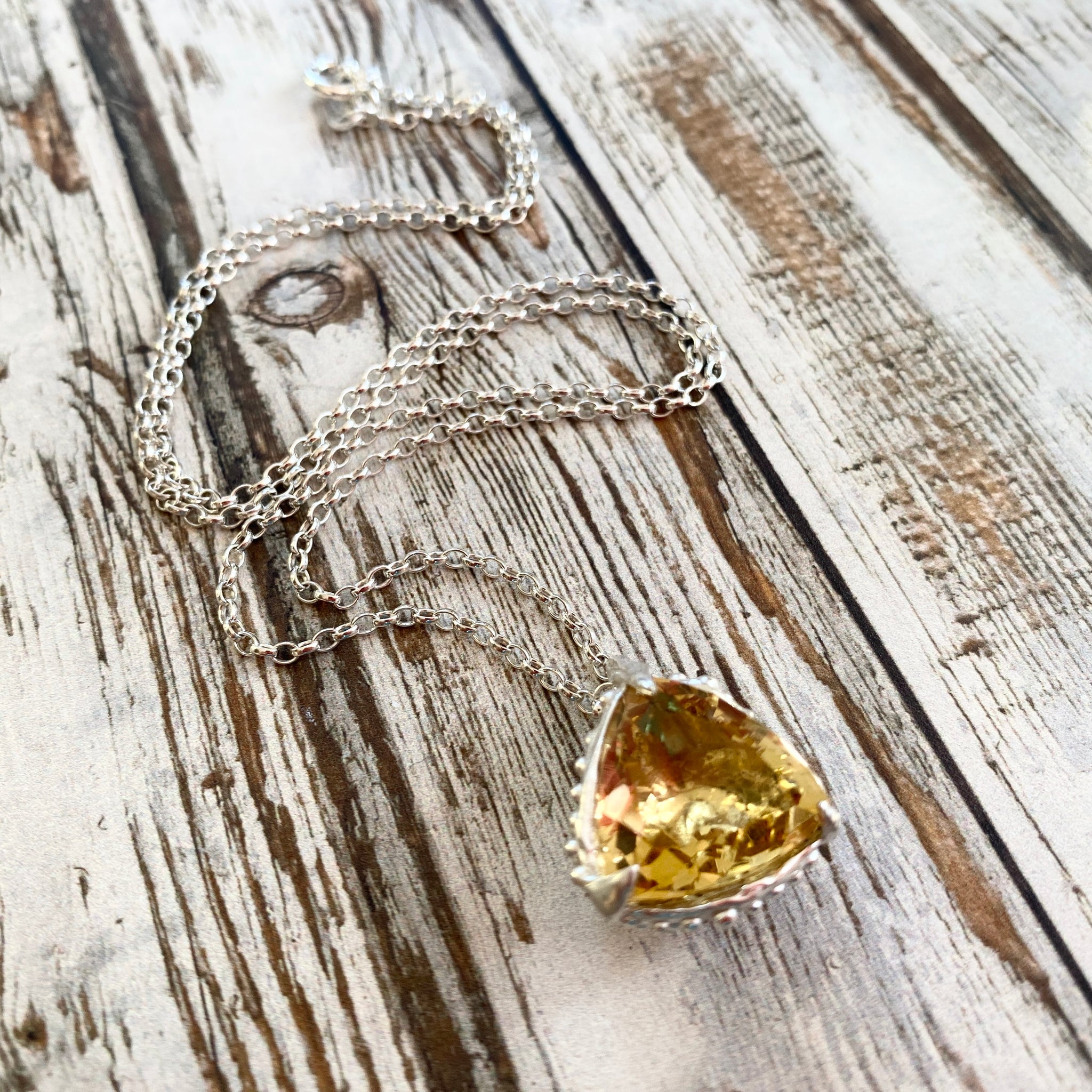 This trillion cut citrine has had its setting carved in wax to fit the stone perfectly. Its organic form reminds me of a conker shell. Hanging on an 18 inch sterling silver belcher chain.