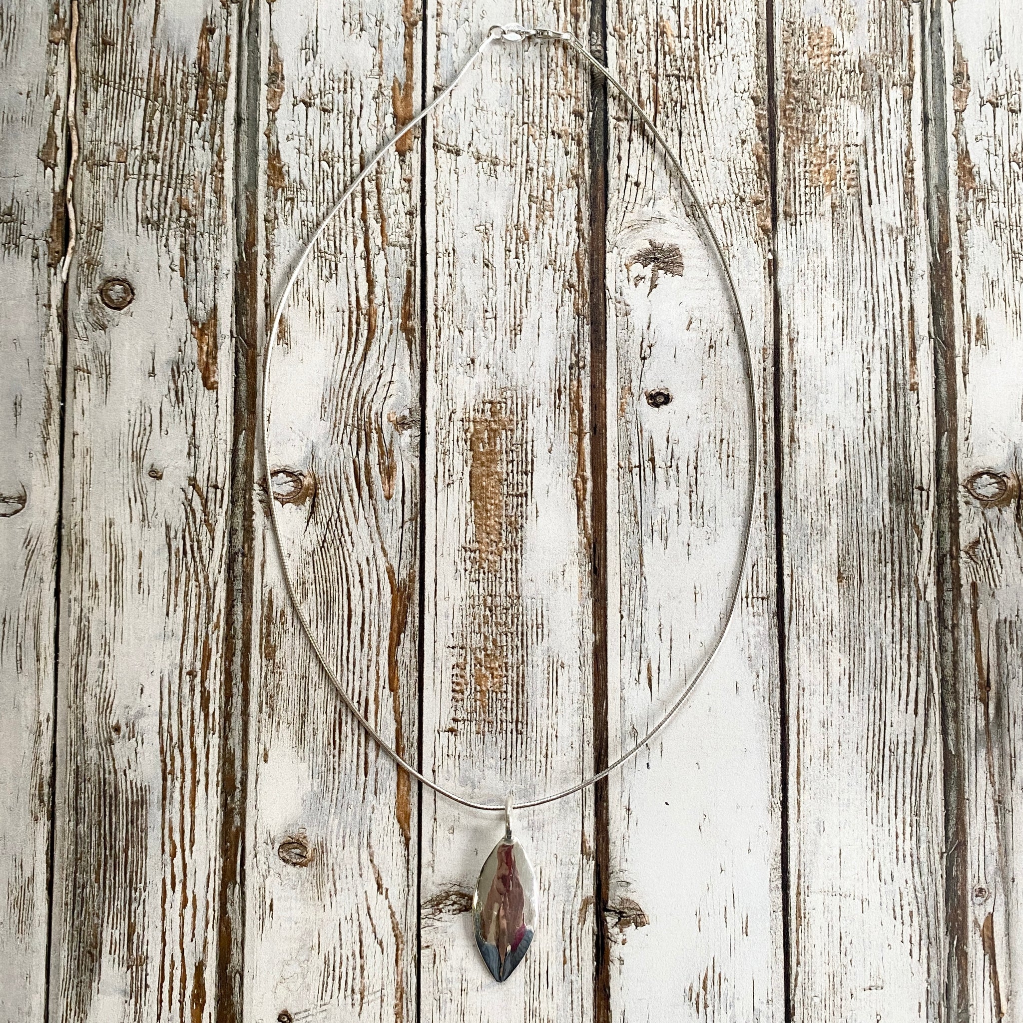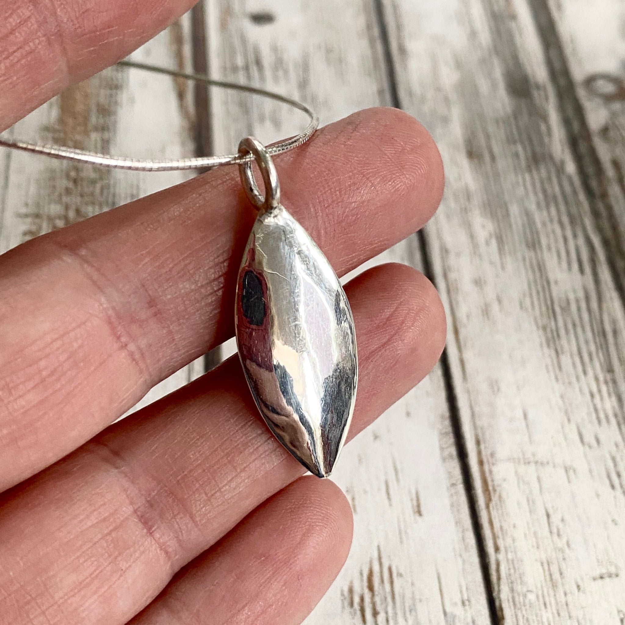 A shield shaped solid silver pendant hanging on a 1mm snake chain to hold its shape on the neck.