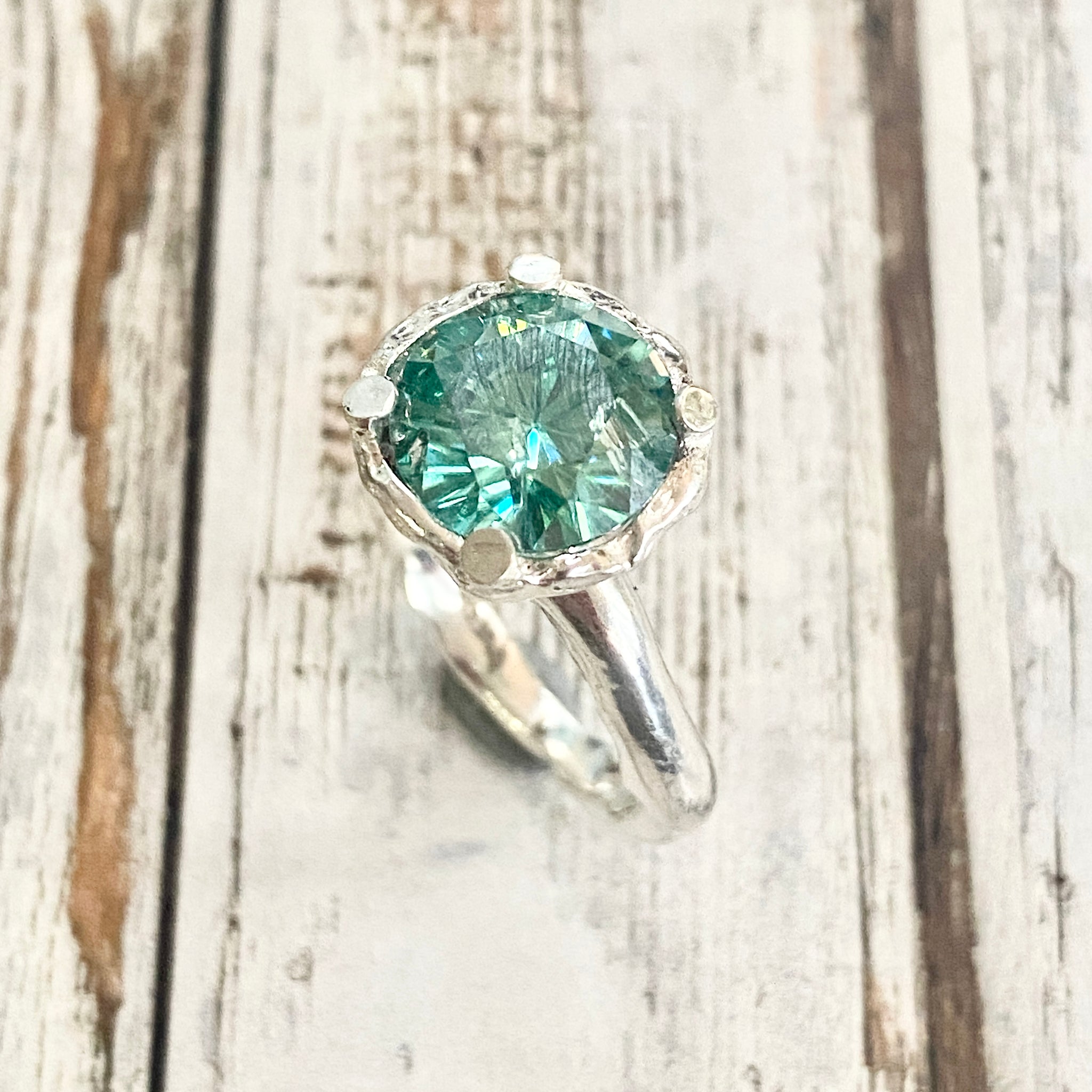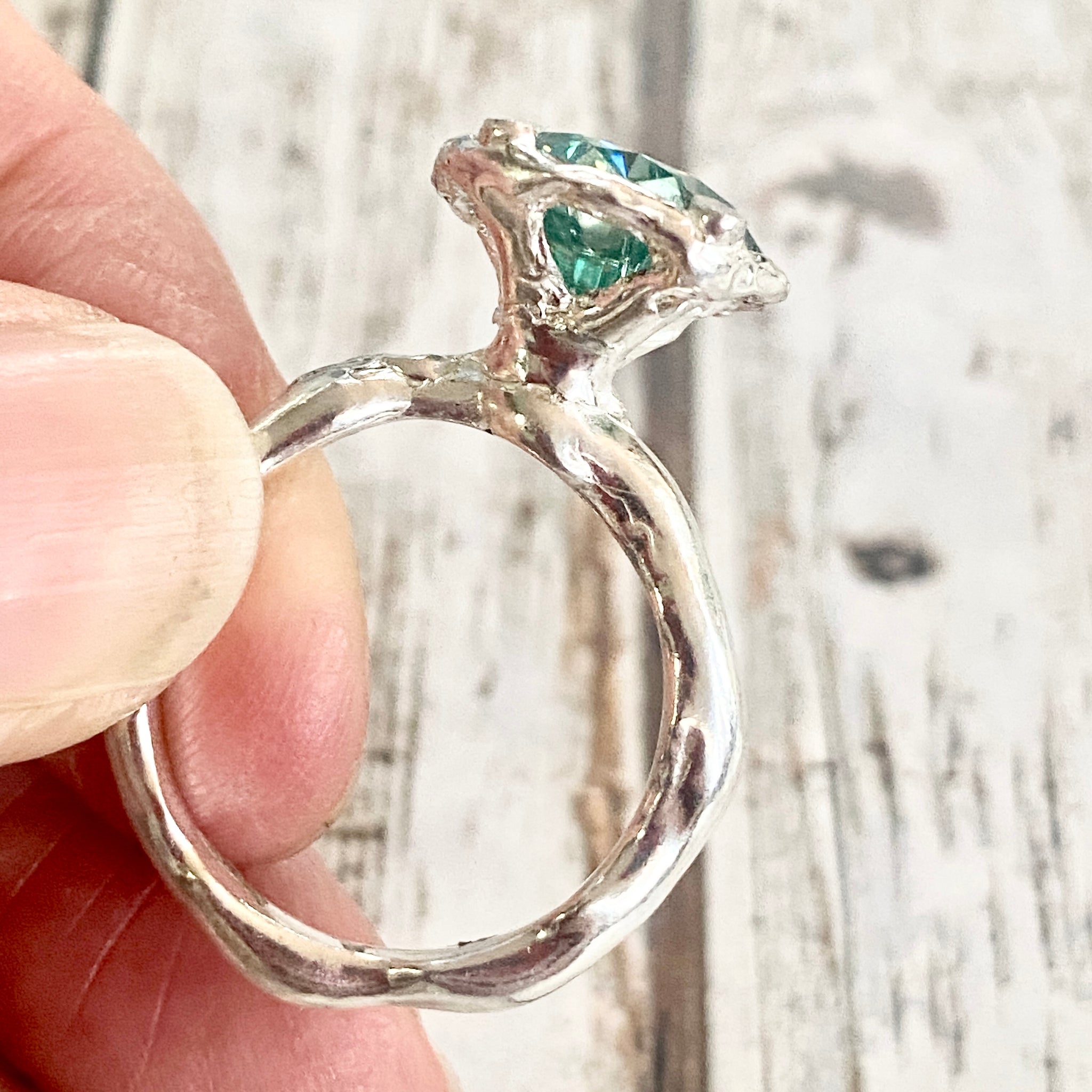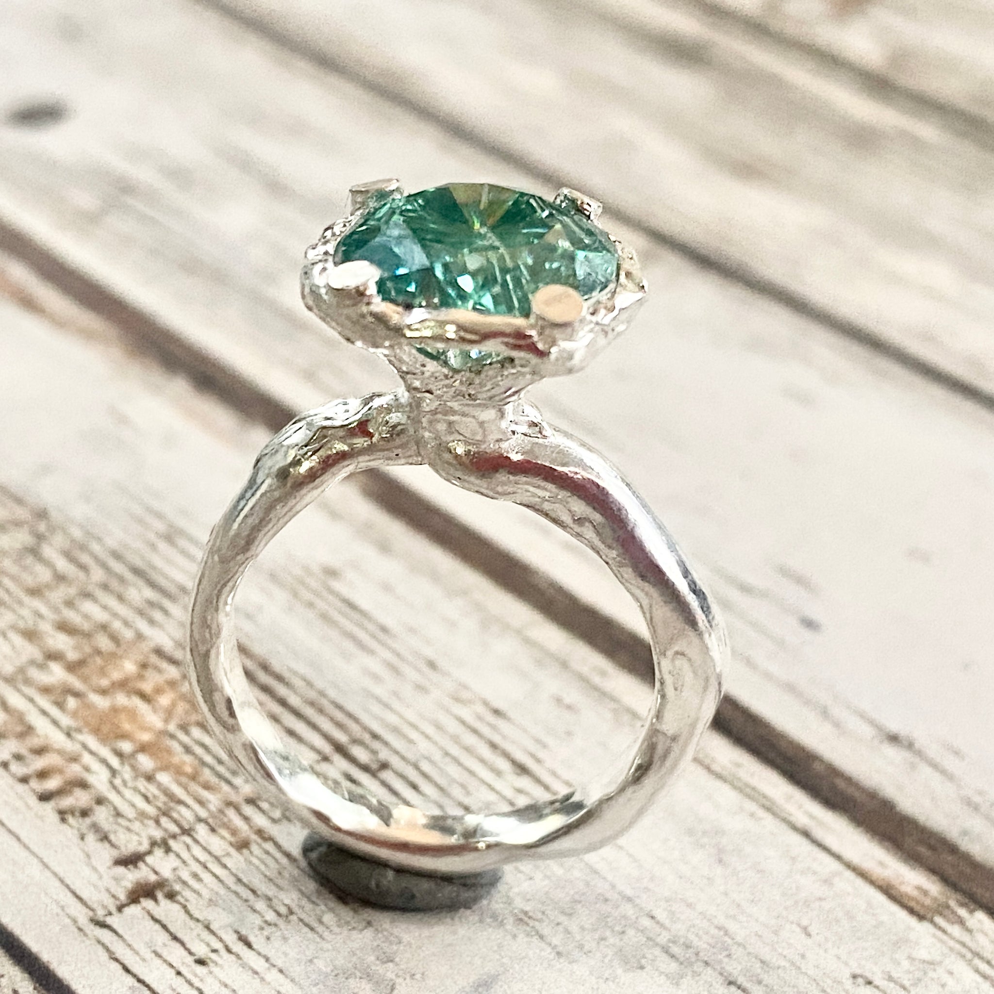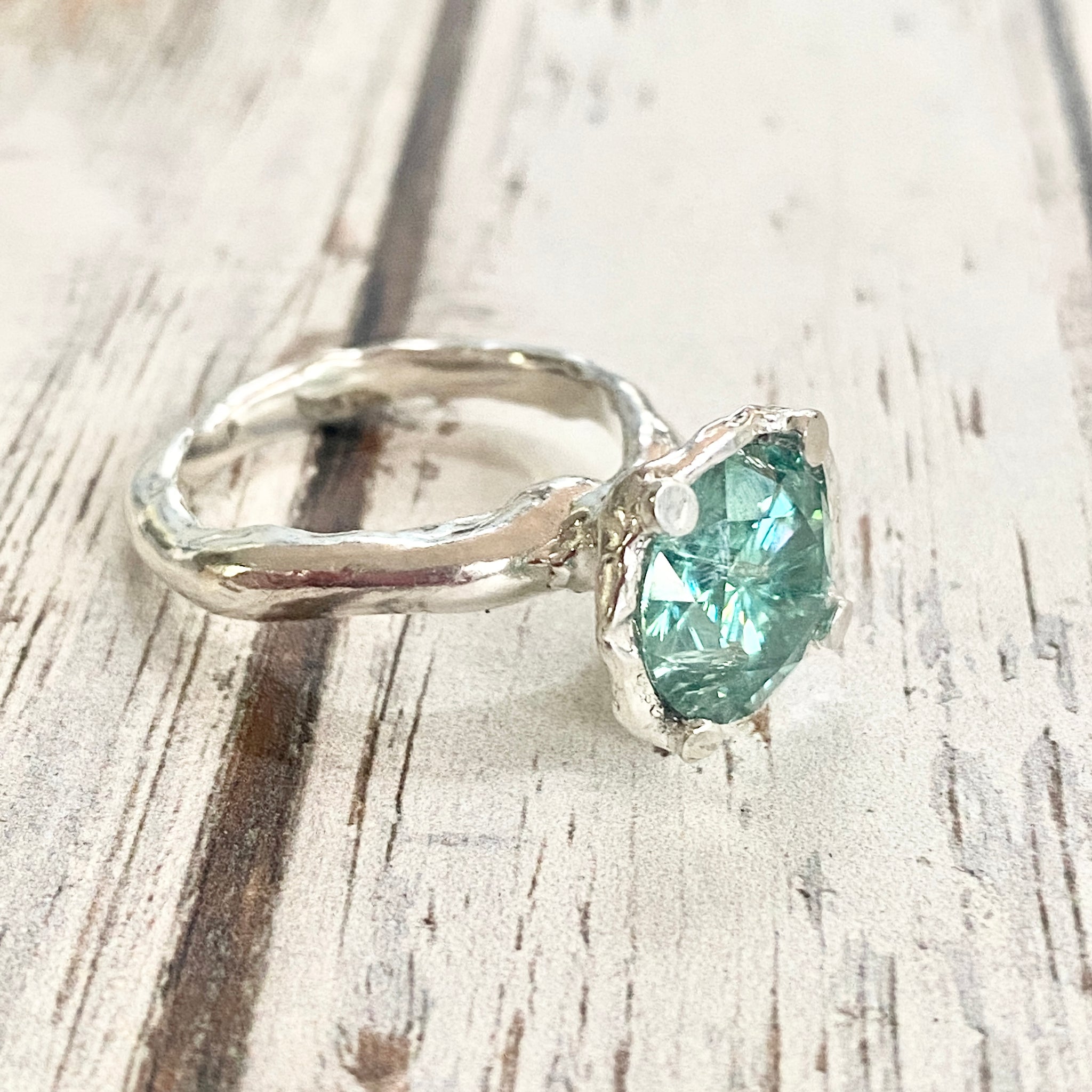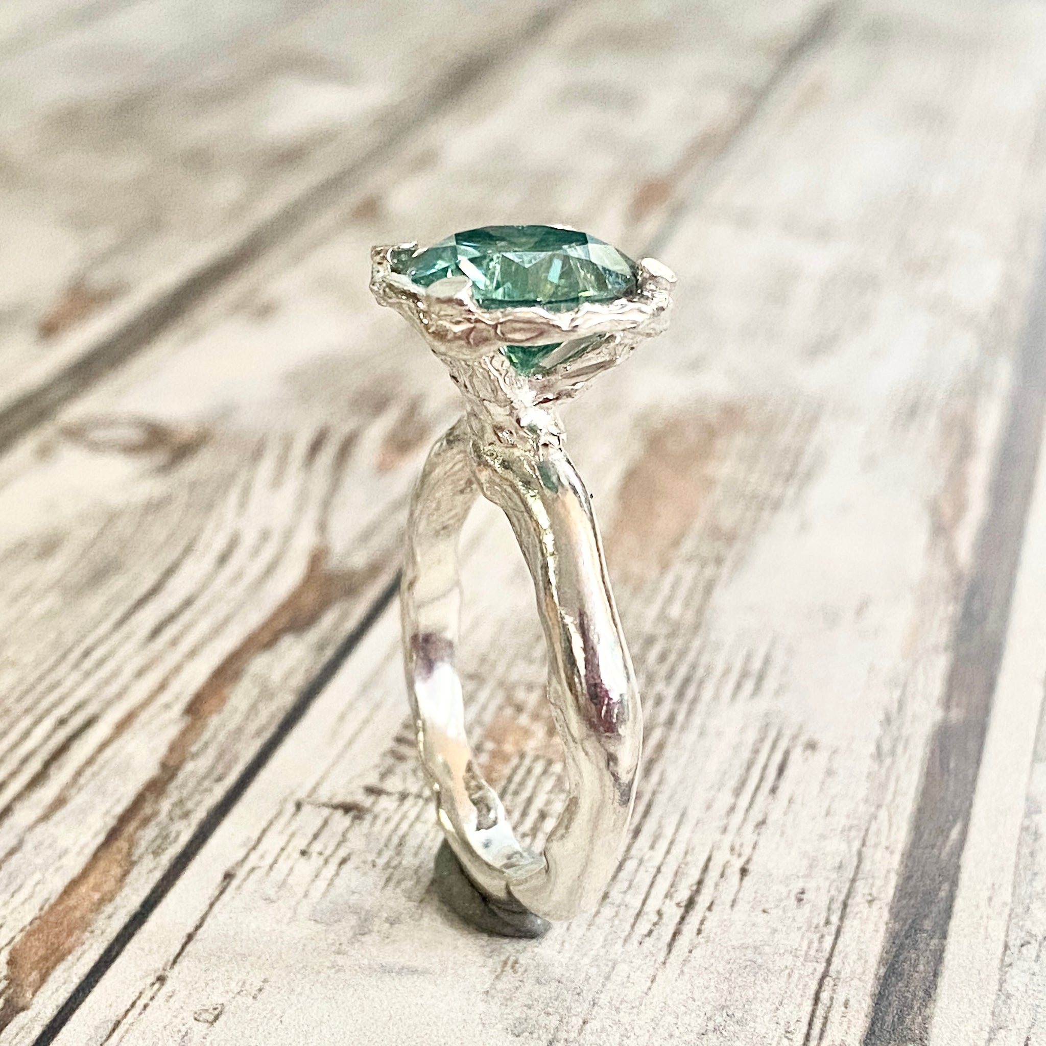 A stunning faceted Moissanite has been set into an organic wax carved setting and band and the contrast of that and the geometric cut stone is fantastic. Claw setting.